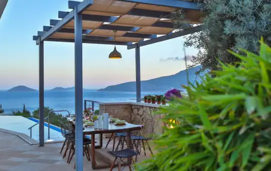Adalar ve Deniz Manzaralı , Geniş aile Villası, Lüks ve Modern Dekorasyon, Jakuzili Villa, Deniz ve Plajlara Yakın Konum, Oda içi tv, Yürüyüş mesafesinde Kalamar Plajı, Kalkan Kiralık Villa.