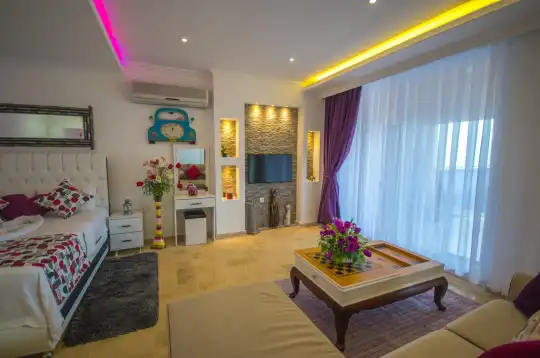 Salonumuzda rahat, modern, lüks oturma grubu, tv ve uydu alıcısı, ütü masası, limitsiz kablosuz internet, havuz kıyısına ve bahçeye çıkış vardır.