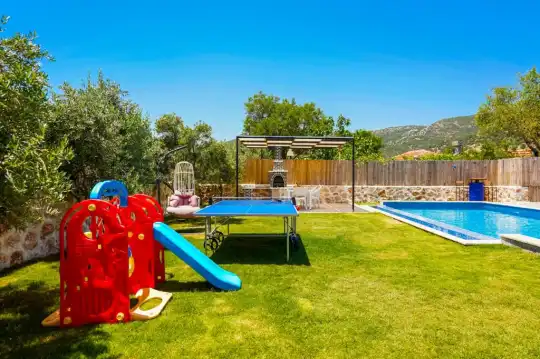 Villa Su Perisi, Kalkan eşsiz bir konumda, muhteşem dağ manzaralı, sessiz ve huzurlu ortama sahiptir. Havuz terasımızda ve bahçemizde yeşillik alanı, çocukların için küçük oyun parkı, salıncak, masa tenisi, şezlong, güneşlenme şemsiyesi, barbekü, pergole, yemek masası ve sandalyeleri ve oturma grubu vardır.