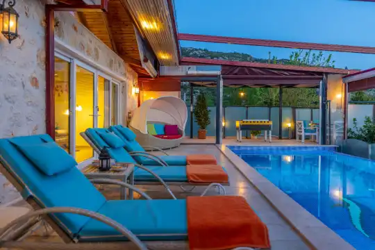 Korunaklı villa, Balayı villası, Jakuzili villa, Isıtma havuzlu villa, Balayı çiftlerine uygun, Doğa ve deniz manzaralı, Kalkan kiralık villa.