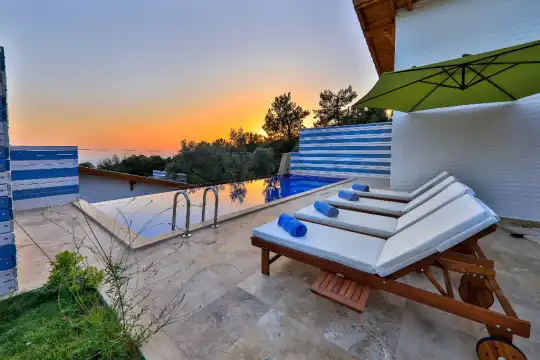 Kalkan Villa Sunset 2 geniş bahçesi ve havuz terası ile siz misafirlerimizin rahatlığı için havuz terasımızda ve bahçemizde şezlong, güneşlenme şemsiyesi, barbekü, hamak,çocuk oyun parkı, yemek masası ve sandalyeleri ve oturma grubu bulunmaktadır.