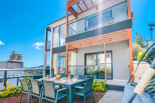 Panoramik kalkan ve deniz manzaralı , Geniş aile villası, Modern ve lüks iç ve dış dekorasyon, Müstakil kiralık villa, Denize yürüyüş mesafesinde olan yazlık, Kalkan kiralık villa.