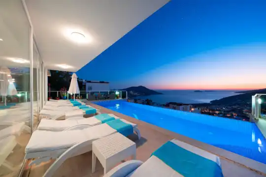 Panoramik kalkan ve deniz manzaralı , Geniş aile villası, Lüks iç ve dış dekorasyon, Sakin bir konum, Kalkan merkeze ve denizine yakın konumda bulunan kiralık villa ve yazlıklar, Kalkan günlük kiralık lüks tatil evi, Oyun odasında langırt, masa tenisi villa, kalkan özel tatil villası, kalkan kiralık villa.