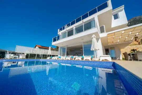 Kalkan renkli kiralık villalarımız arasında kendisine yer alan havuz terasında mangal, yemek masası, şezlong ve güneşlenme şemsiyesi mevcut olup muhteşem deniz manzaraya karşı yaz tatil yapacağınızdan emin olabilirsiniz.