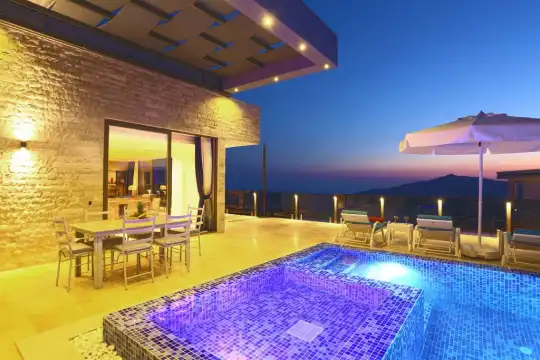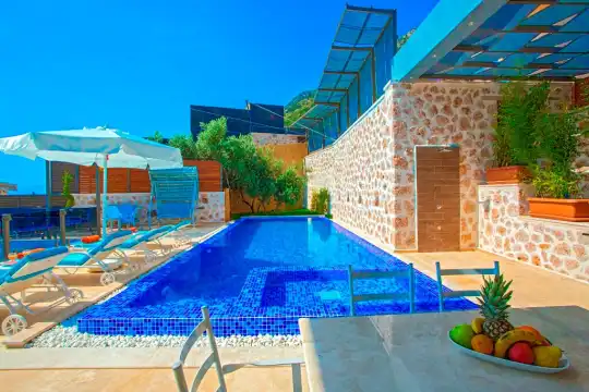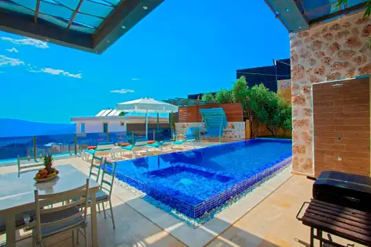 Panoramik kalkan ve Deniz Manzaralı , Geniş aile villası, Lüks iç ve dış dekorasyon, Sakin bir konum, Havuz terasında taştan barbekü, Jakuzili Özel Tatil Villası, Kalkan merkeze ve denize yakın konumda bulunan kiralık villa ve yazlıklar, Kalkan günlük kiralık lüks tatil evi. Kalkan Muhafazakar Villa
