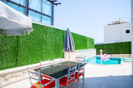 Villa Yıldız geniş bahçesi ve havuz terası ile siz misafirlerimizin rahatlığı için havuz terasımızda ve bahçemizde yeşillik alanı, salıncak, hamak, şezlong, güneşlenme şemsiyesi, barbekü, yemek masası ve sandalyeleri ve oturma grubu bulunmaktadır.