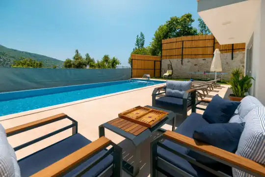 Doğa ve Deniz manzaralı, Balayı çiftine uygun, Büyük oda içi jakuzi, Büyük özel havuzlu villa, Muhafazakar tatil balayı villası, Modern iç ve dış eşyalar, Balayı çiftine fiyata uygun villa, Tam korunaklı tatil villası, Kalkan Kiralık Villa, Havuz başında barbekü, Masa tenisli villa, Kobra şelaleli villa, Havuz başı salıncaklı villa