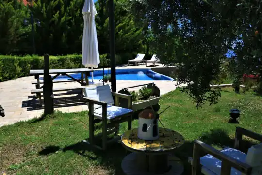 Kalkan Villa zeytin evi geniş bahçesi ve havuz terası ile siz misafirlerimizin rahatlığı için havuz terasımızda ve bahçemizde şezlong, güneşlenme şemsiyesi, barbekü, yemek masası ve sandalyeleri ve oturma grubu bulunmaktadır.