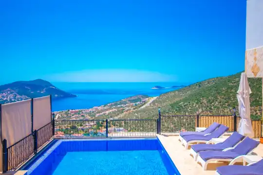 Kalkan denizi manzaralı , Geniş aile villası, Lüks ve modern tasarım, Sakin bir konum, Kalabalık arkadaş grubu, Ful deniz manzaralı.