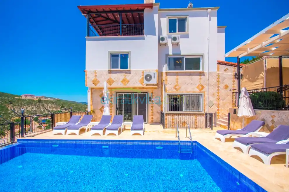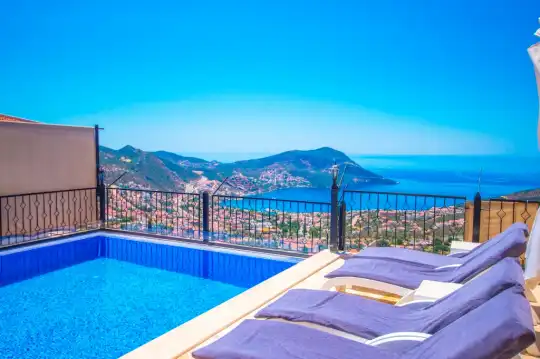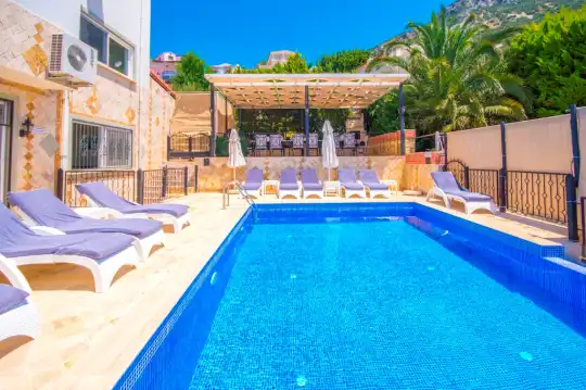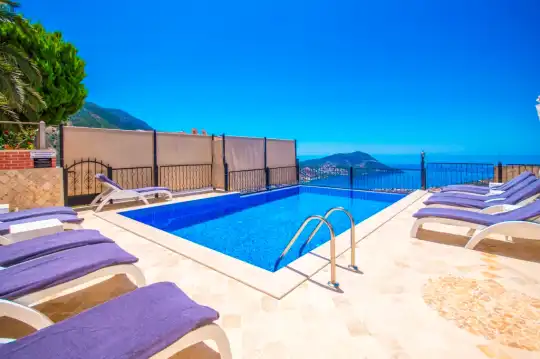 Kiralık Villa Zirve Kalkan’da 9 yatak odalı, 19 kişilik geniş ve kalabalık aileler için oldukça ideal bir yazlık evi'dir. Villamızda misafirlerimiz için herşey en ince ayrıntısana kadar düşünülmüştür. Panoramik Kalkan denizi manzaralı olan villamızın etrafı yeşilliklerle kaplı olup, havuz terasında masa ve sandalyeler ile üzeri üzüm bağı gibi ağaçla çevrilidir. Villamız modern ve lüks bir iç-dış tasarıma sahiptir. Eşyaları özenle dizayn edilmiş olan bu yazlıkta kendinizi rahat ve ferah hissedip kendi evinizde gibi hissedeceksiniz.